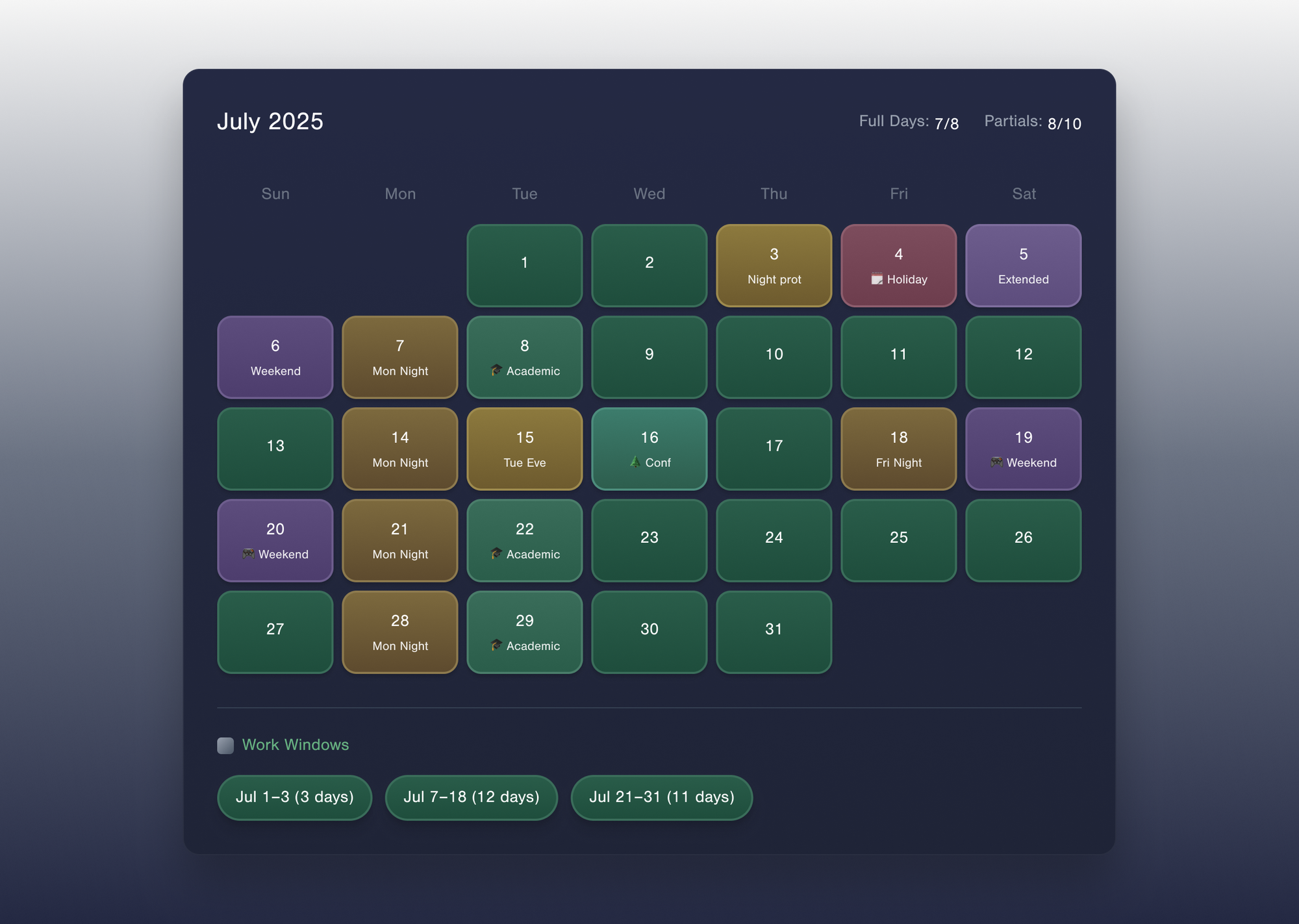 Our department uses QGenda for scheduling. It works, but it wasn’t designed with emergency physicians in mind. The software optimizes for coverage, not for the humans providing it. The result? Schedules that technically fill all the slots but leave you feeling fragmented. Night islands. Rapid turnarounds after nights. Chunks of time off that land on the wrong days.