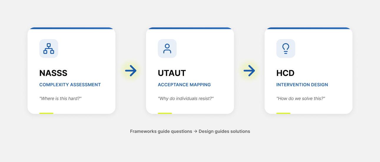 Think of it like medicine. UTAUT and NASSS are diagnostic tools. They help you understand what's happening and why. Human-centered design is the treatment. It helps you create solutions.