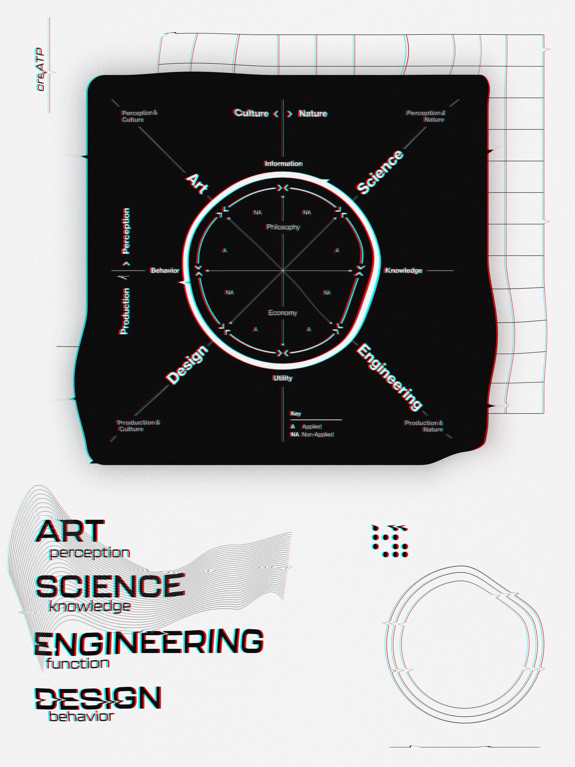 This illustration was initially published in an article Oxman wrote in the Journal of Design and Science entitled Age of Entanglement. It shows how (creative) energy is passed through the four areas of human creativity; Art, Science, Engineering, and Design. In the episode, she explains how information is processed through the scientific method to become human knowledge. Knowledge informs building and constructing the physical world. The physical world is refined through design to alter human behavior, which changes people's perception of the world through art. I paused the episode and sat in amazement. It's a visual representation of the exact thing I've always felt but never knew how to express.